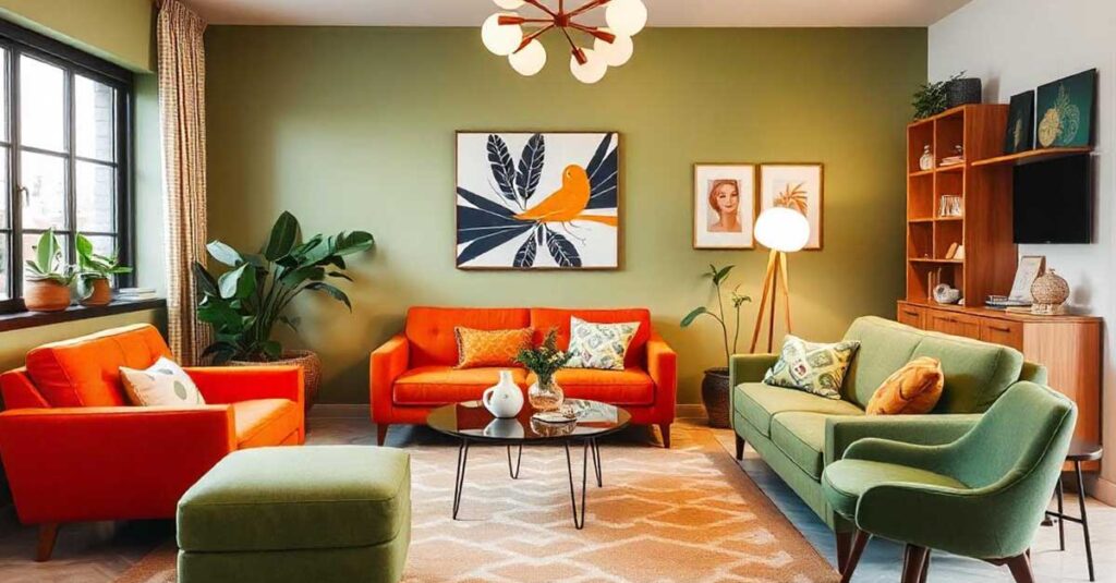 Mobiliario icónico: Sofás curvos, mesas de centro con patas cónicas y sillas de plástico moldeado son esenciales para lograr un look auténtico.