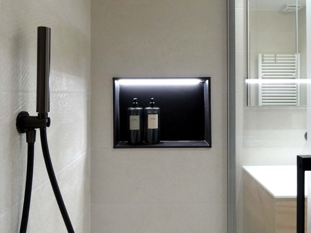 Accesorios oscuros y una hornacina negra dan un toque especial a este baño neutro
