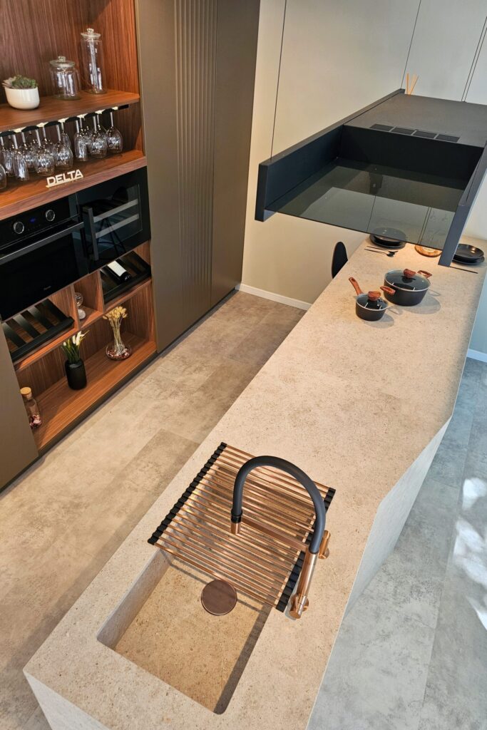 Para el proyecto de showroom de Delta Estudio 180 en Madrid se han creado diferentes ambientes completamente diferentes, con el objetivo de mostrar todo el potencial que esta marca ofrece. La combinación piedras naturales en encimeras, los muebles lacados, vidrios y maderas naturales se han escogido cuidadosamente para dotar de elegancia y calidad a los espacios.